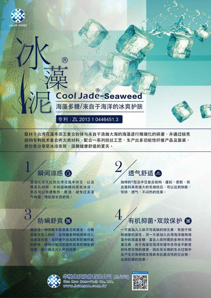 簡介 取材於台灣花蓮豐田玉複合粉體與來自於浩瀚大海的海藻進行精細化的研磨,並通過核殼結構專利技術複合兩大類材料,配合一系列紡絲工藝,生產出多功能性纖維產品及服裝,使你充分享受冰涼親膚,溫馨健康舒適的夏天。 功能 瞬間涼感 透氣舒適 防螨舒爽 有機抑菌,雙效保護 DM 英文版 日文版 影片