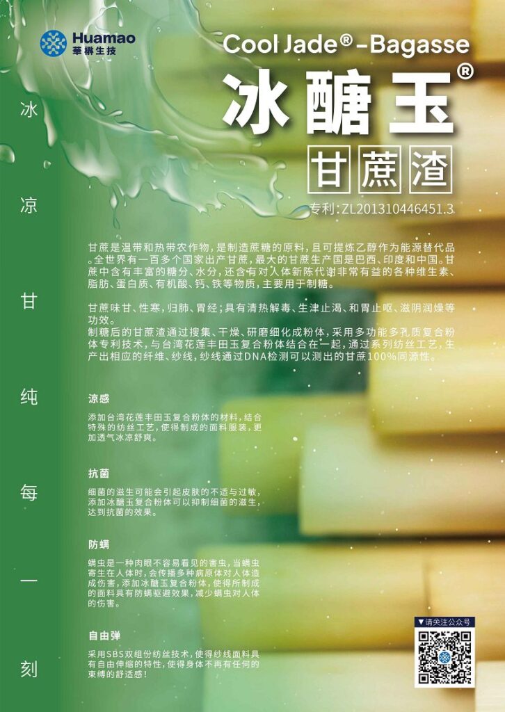 簡介 製糖後的甘蔗渣通過蒐集、乾燥、研磨細化成粉體,採用多功能多孔質複合粉體專利技術,與台灣花蓮豐田玉複合粉體結合在一起,通過系列紡絲工藝,生產出相應的纖維、紗線,紗線通過DNA檢測可以測出甘蔗100%同源性。 功能 涼感 抗菌 防螨 自由彈 DM 英文版 日文版