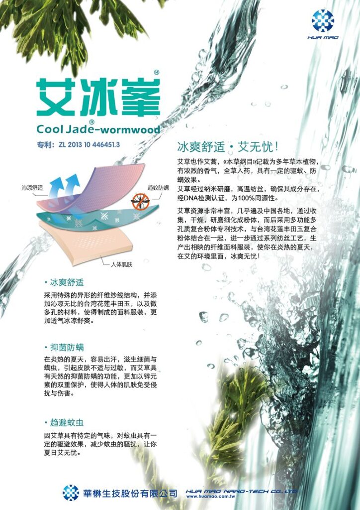 簡介 艾草也做艾篙,《本草綱目》紀載為多年草本植物有濃烈的香氣,全草入藥,具有一定的驅蚊、防螨效果。艾草經過奈米研磨,高溫紡絲,確保其成分存在,經DNA檢測認證,為100%同源性。 功能 瞬間涼感 透氣舒適 防螨舒爽 有機抑菌,雙效保護 DM 英文版 日文版 影片