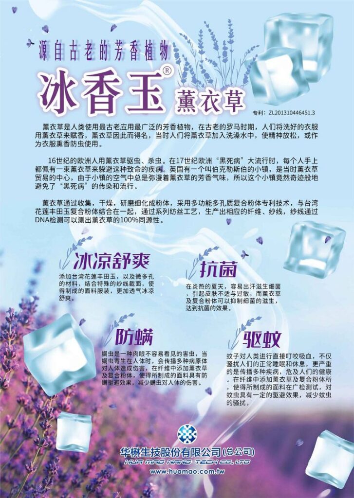 簡介 薰衣草通過收集、乾燥、研磨細化成粉體,採用多功能多孔質複合粉體專利技術,與台灣花蓮豐田玉複合粉體結合在一起,通過系列紡絲工藝,生產出相應的纖維、紗線、紗線通過DNA檢測可以測出薰衣草的100%同源性。 功能 冰涼舒爽 抗菌 防螨 驅蚊 DM 英文版 日文版 影片