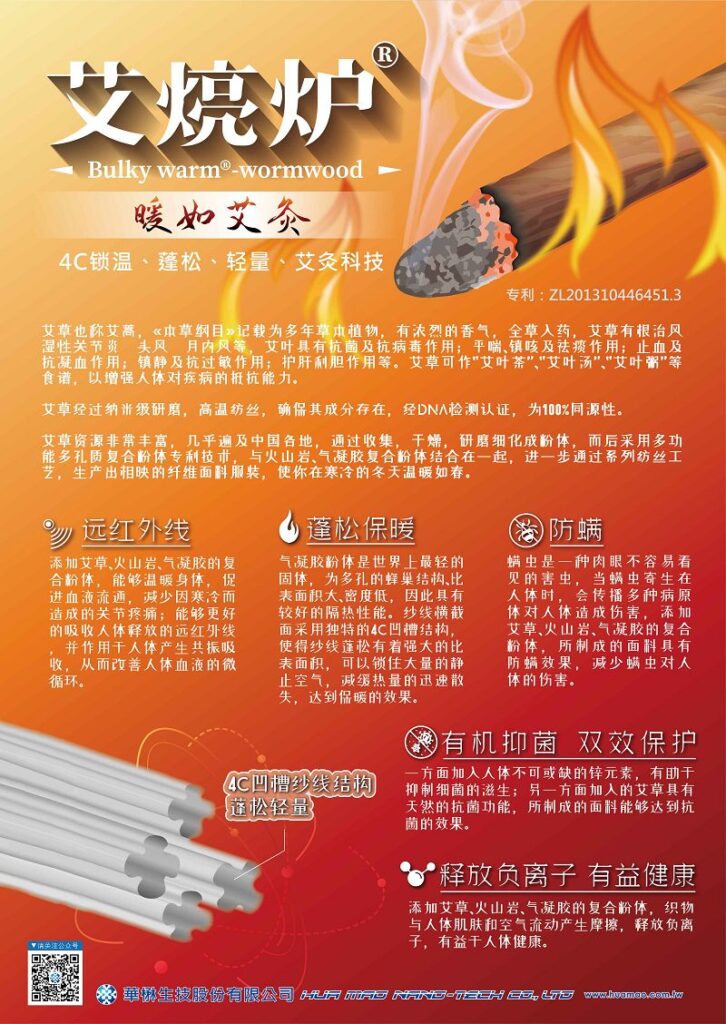 簡介 艾草資源非常豐富,幾乎遍及中國各地,通過收集,乾燥,研磨細化成粉體,而後採用多功能多孔質複合粉體專利技術,與火山岩、氣凝膠複合粉體結合在一起,進一步通過系列紡絲工藝,生產出相應的纖維面料服裝,使你在寒冷的冬天溫暖如春。 艾草通過奈米研磨,高溫紡絲,確保其成分存在,經DNA檢測認證,為100%同源性。 功能 遠紅外線 蓬鬆保暖 防螨 有機抑菌,雙效保護 釋放負離子,有益健康 DM 英文版 日文版 影片