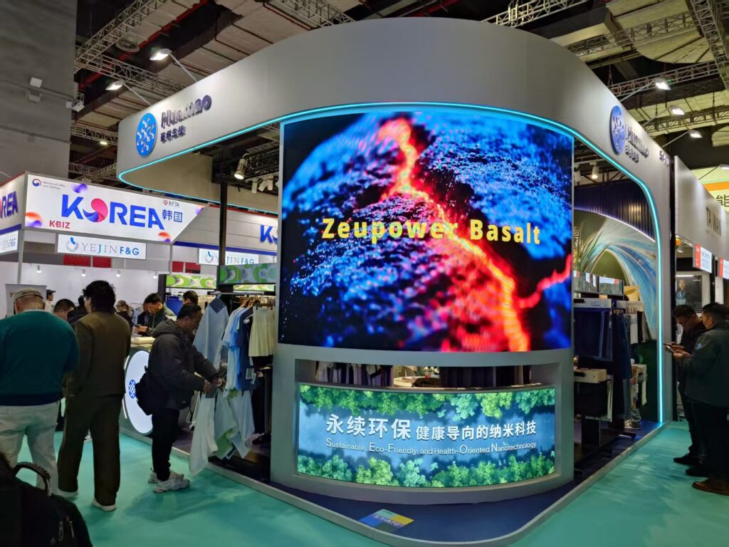 展位上詢問度最高的機能性紗線同樣精彩:熱咖絨-咖啡因紗線,以及冰啡玉、玄烽岩-玄武岩紗線,兼具機能與環保,成為買家焦點。